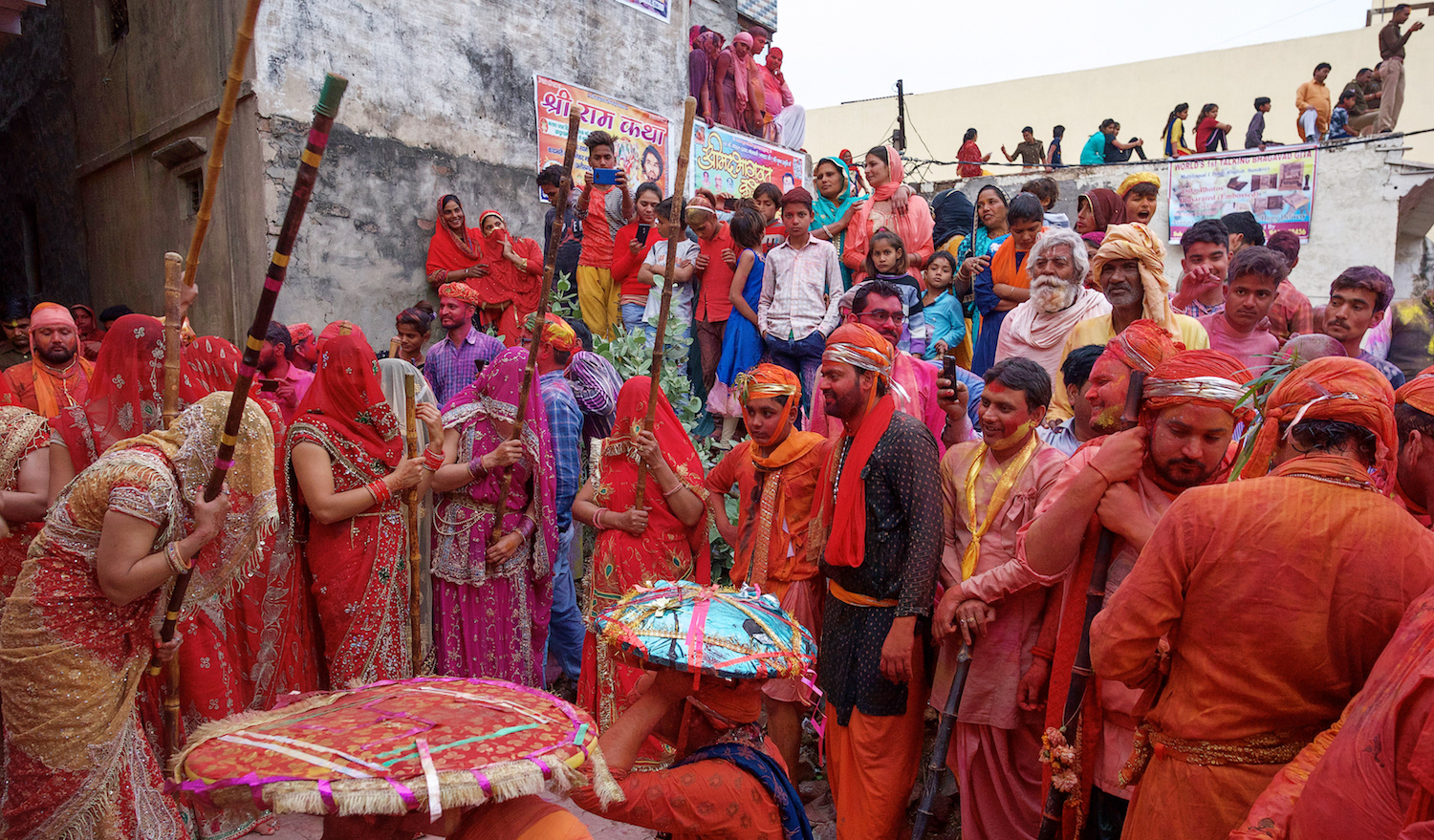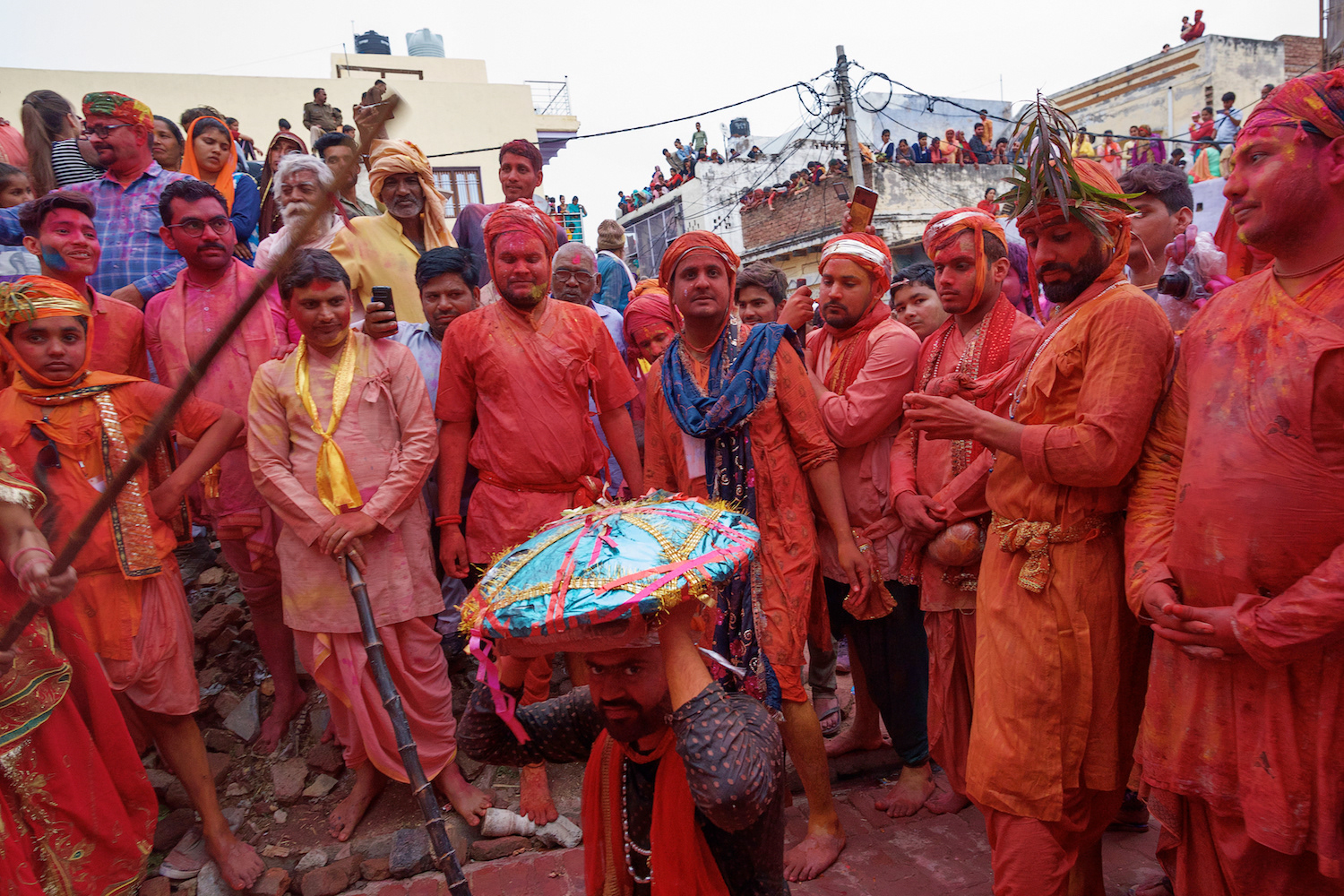 The streets and rooftops of Nandgaon are packed with people watching this amazing spectacle.