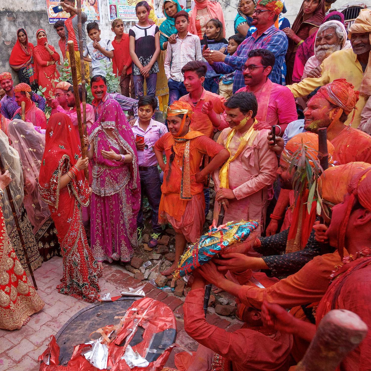Nandgaon is Lord Krishna’s birthplace and Radha, his beloved, came from Barsana. The Radha-Krishna love-story is one of the most famous in Hindu mythology. According to legend, it is believed that Lord Krishna and his friends visited Radha in Barsana during Holi. When Lord Krishna applied colour on Radha's face and teased her, her friends and the elder females of the town took offence and drove them away with bamboo sticks (lathis), hence the tradition of women hitting men with sticks.