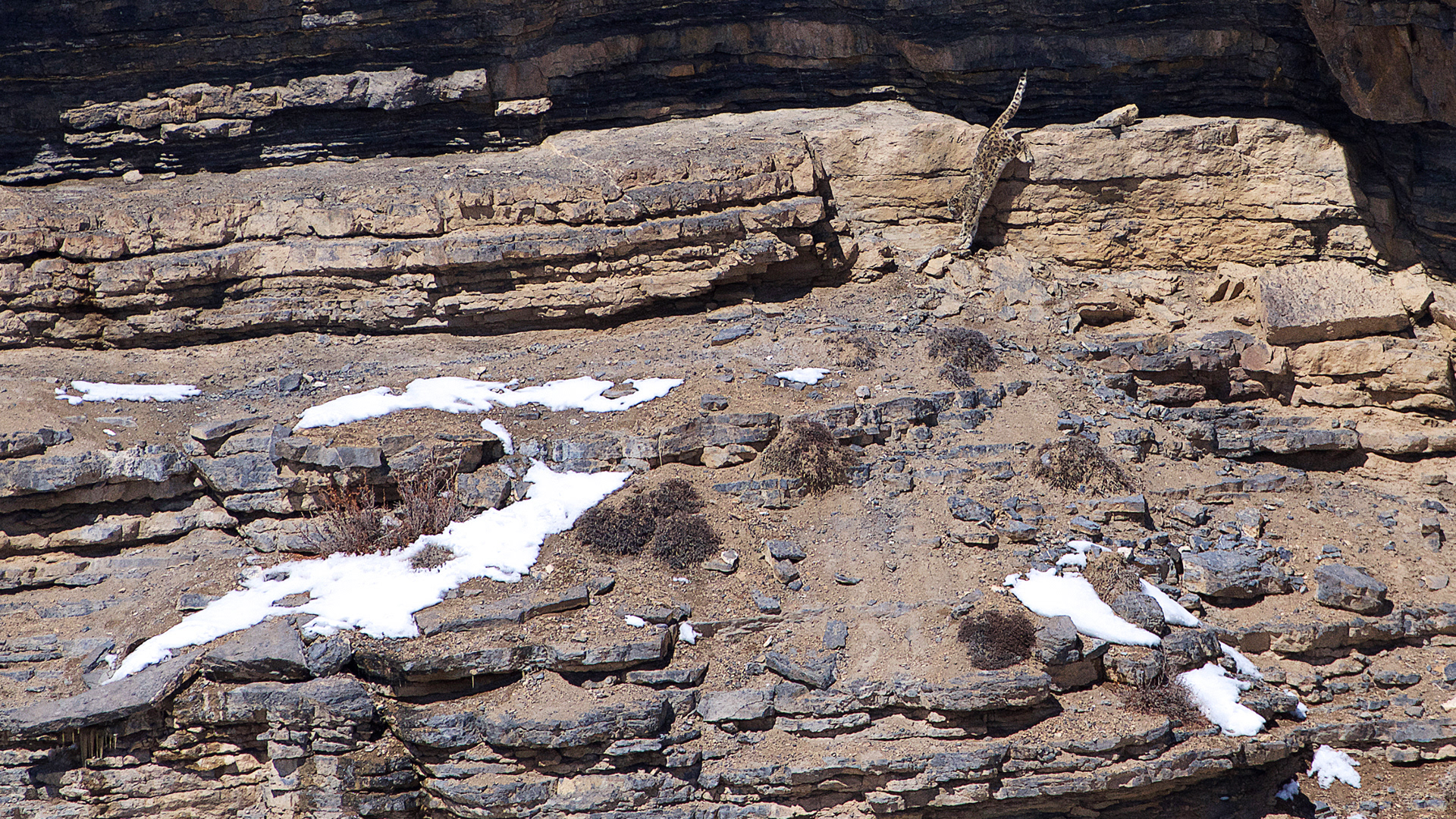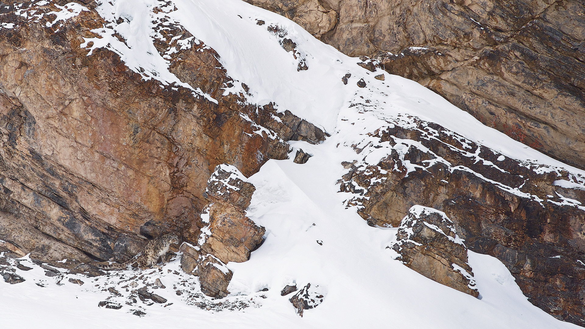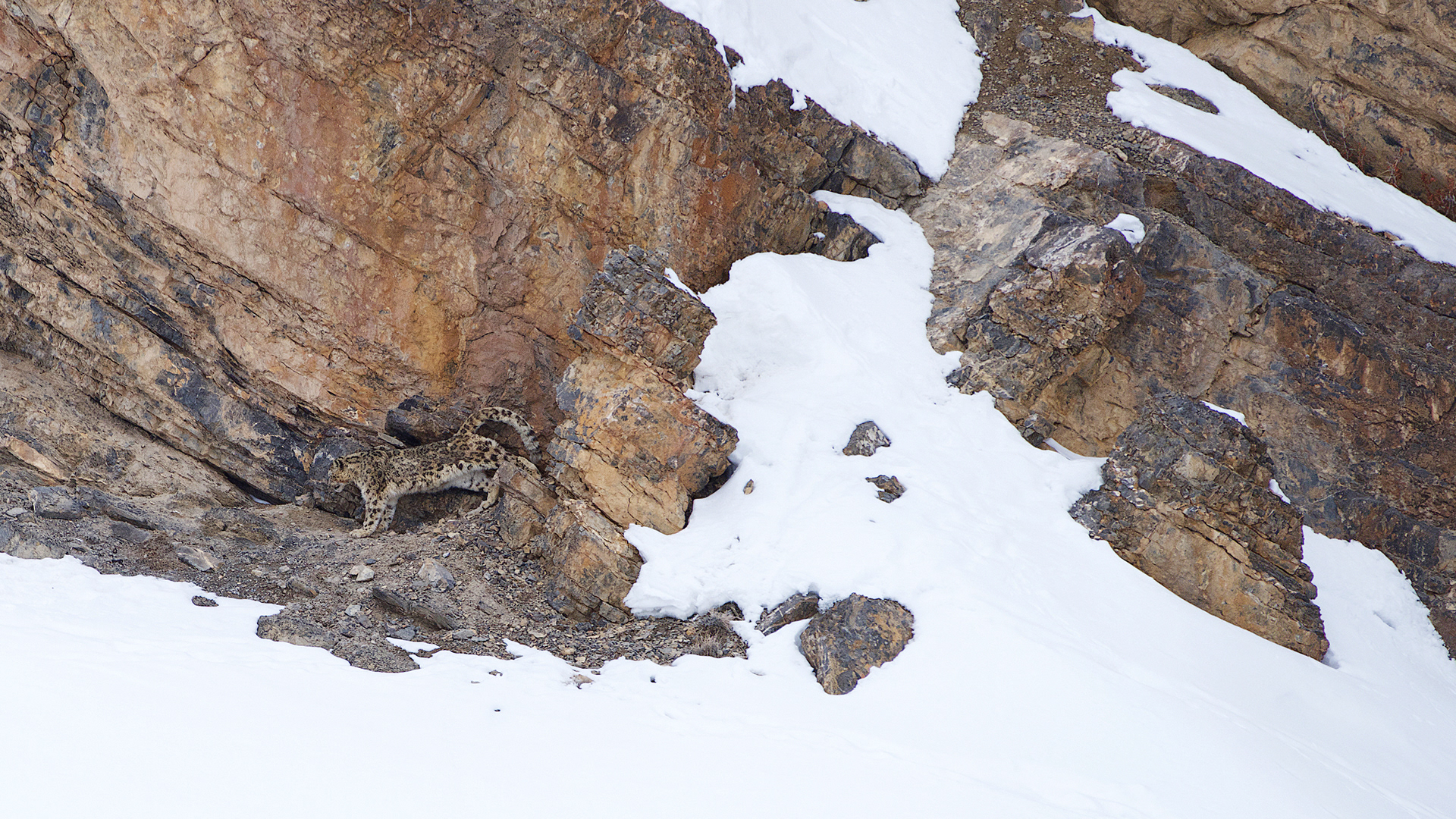 We are duly rewarded with a spectacular view across the ravine and a Snow Leopard sleeping on a narrow shelf of the rocky outcrop in front of us.