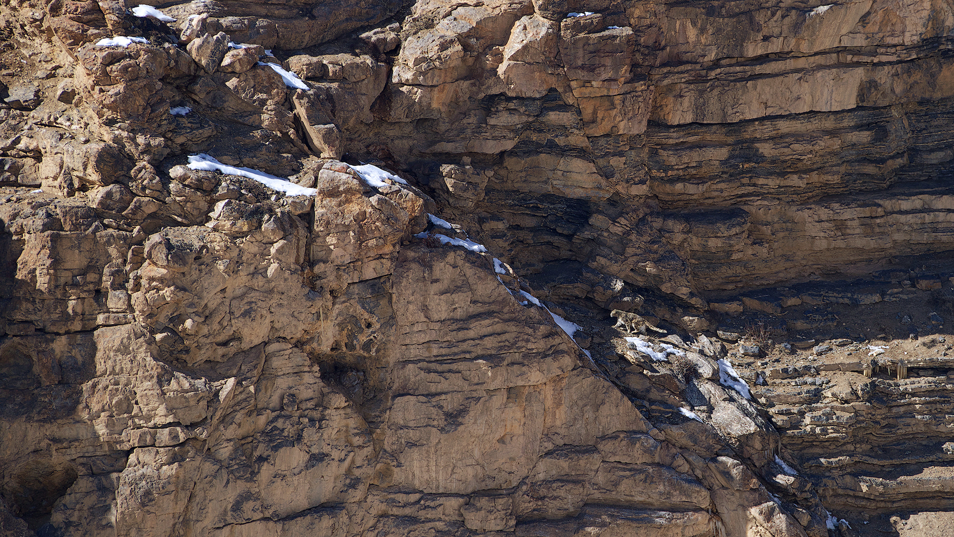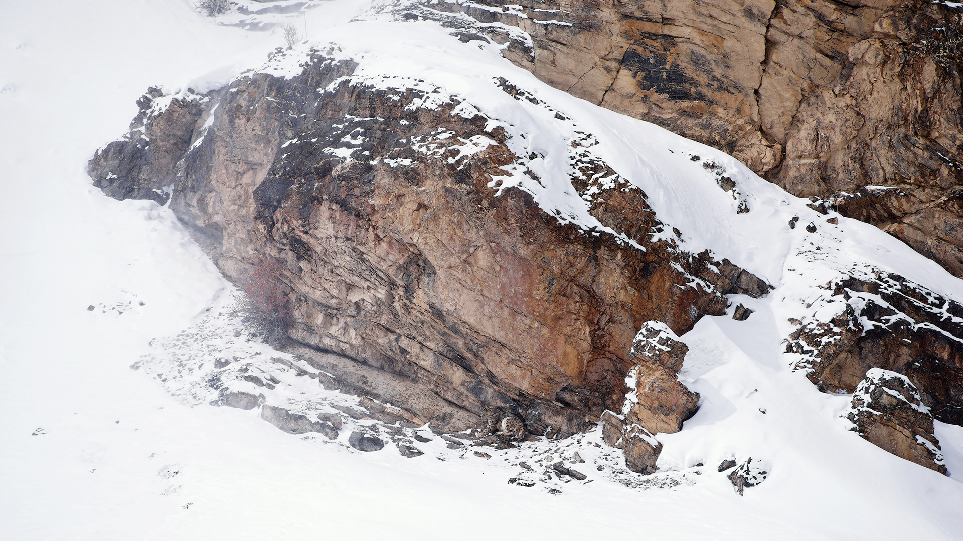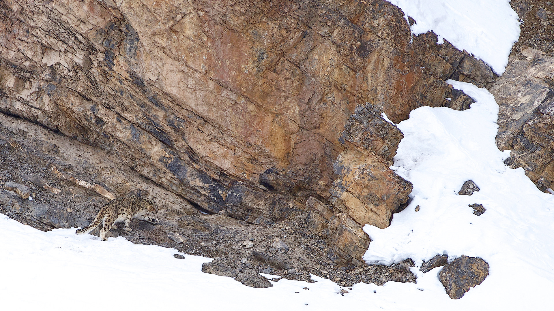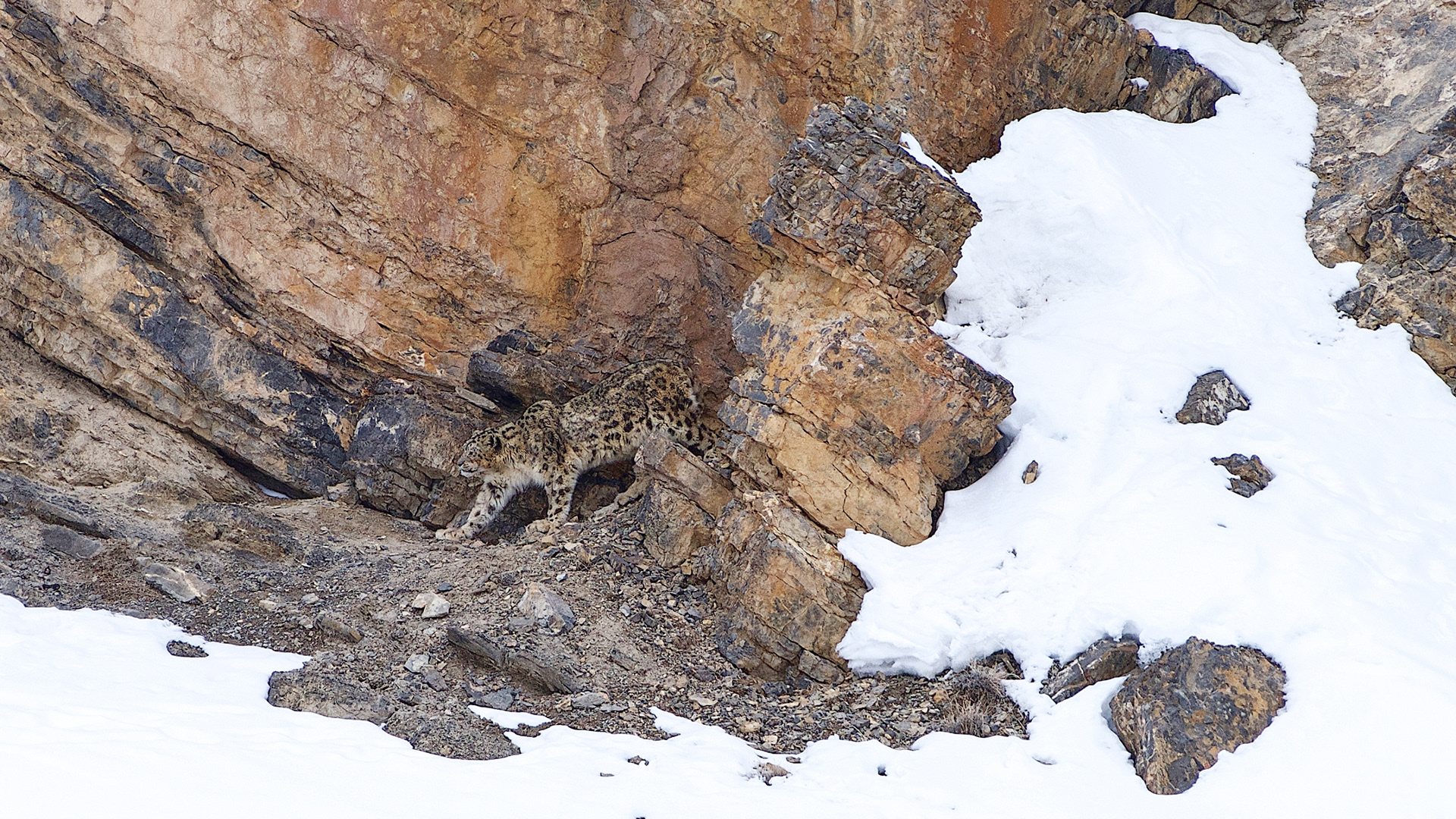 We are duly rewarded with a spectacular view across the ravine and a Snow Leopard sleeping on a narrow shelf of the rocky outcrop in front of us.