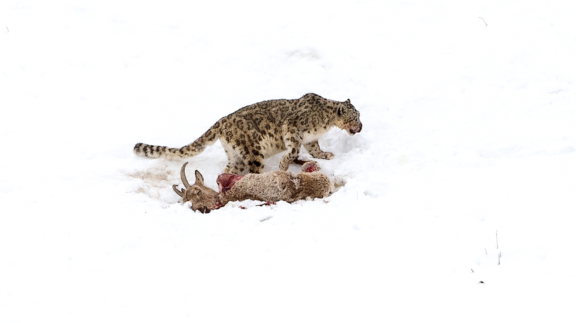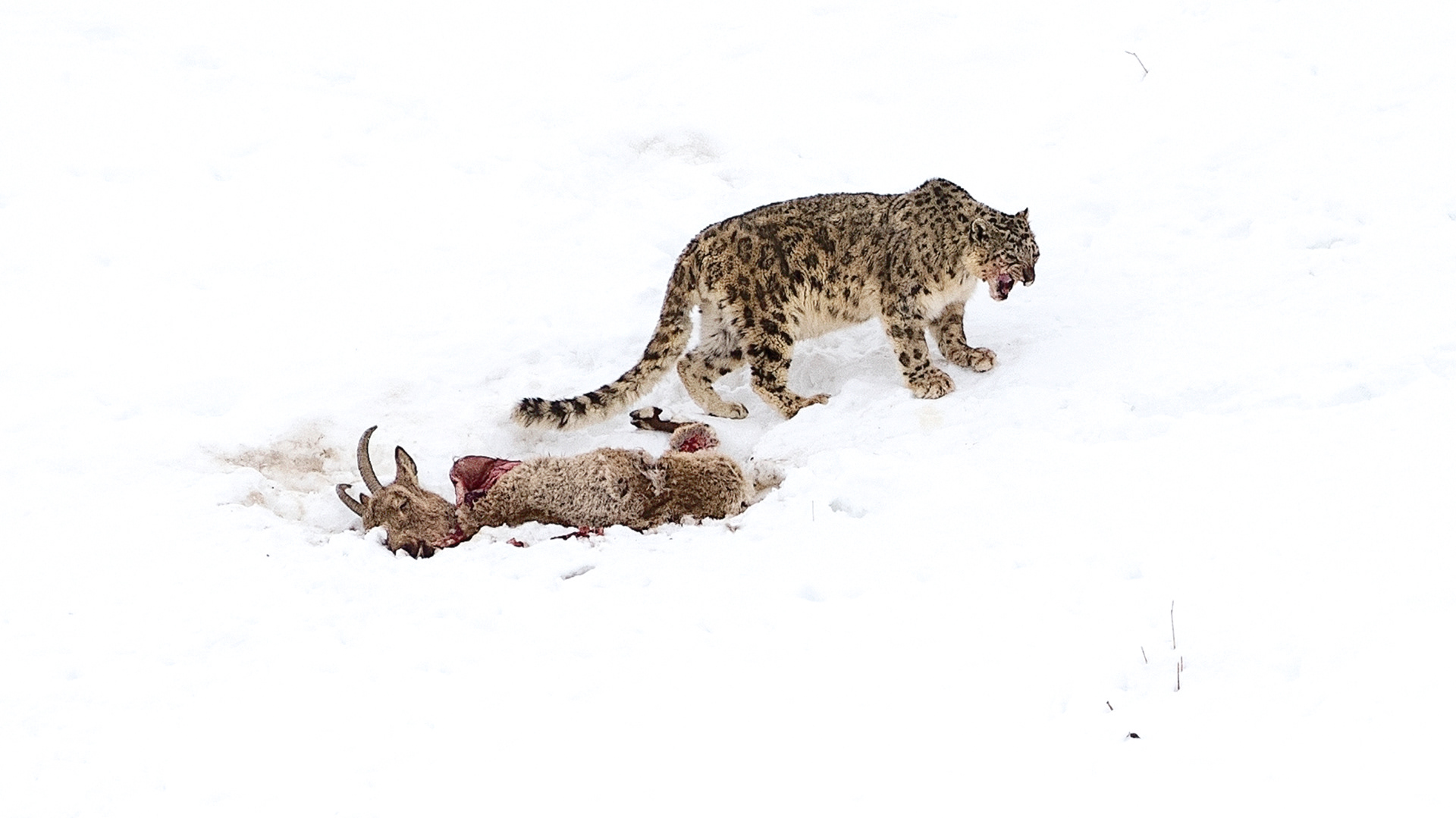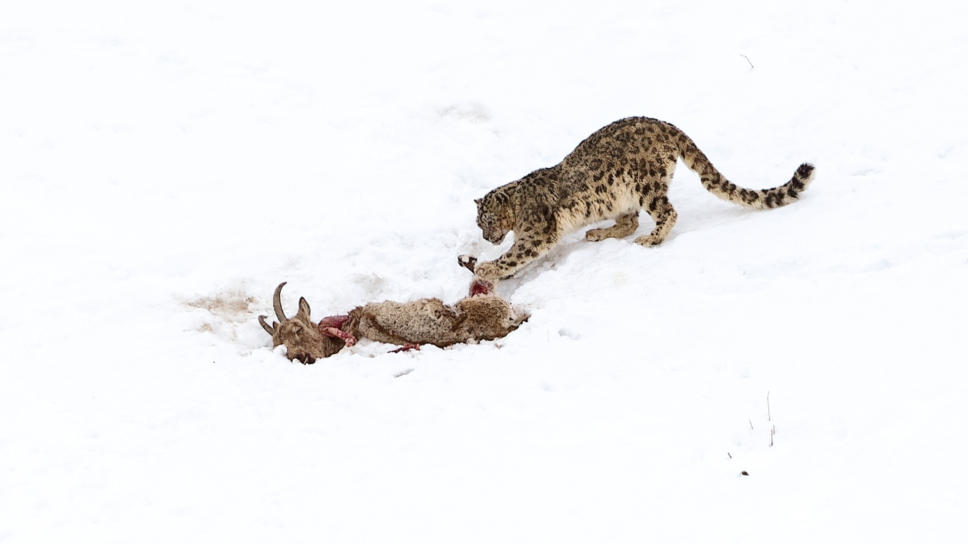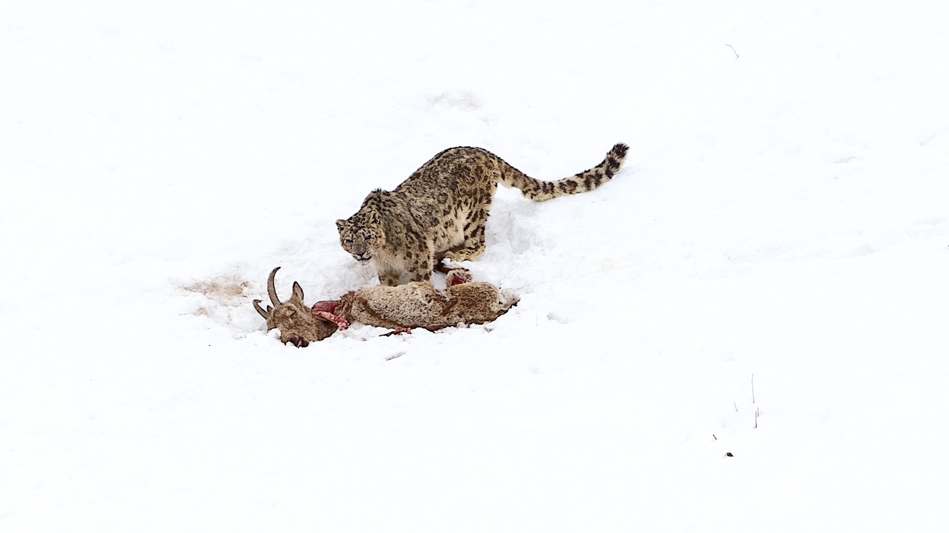 The Snow Leopard walked a short distance from his resting place to the carcass of an Ibex, a large wild goat, which he had killed two days earlier.