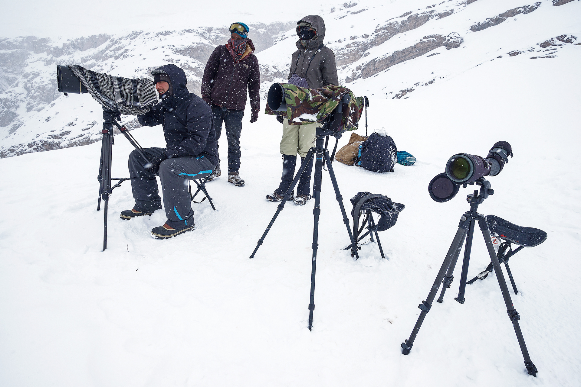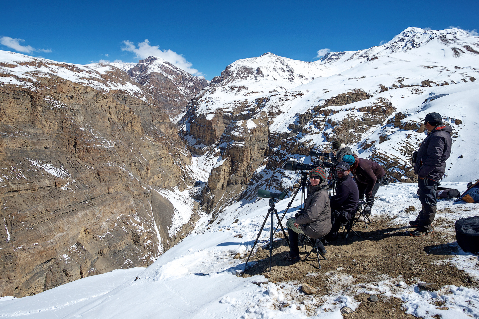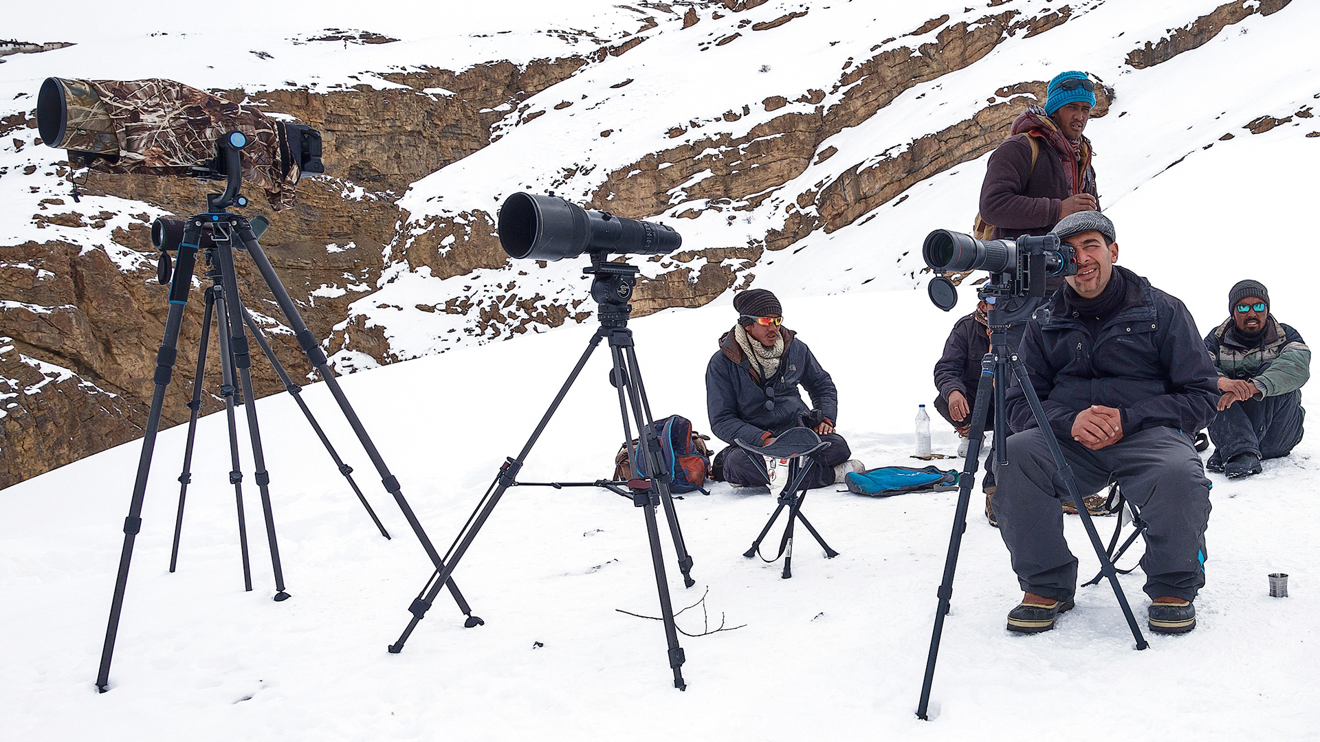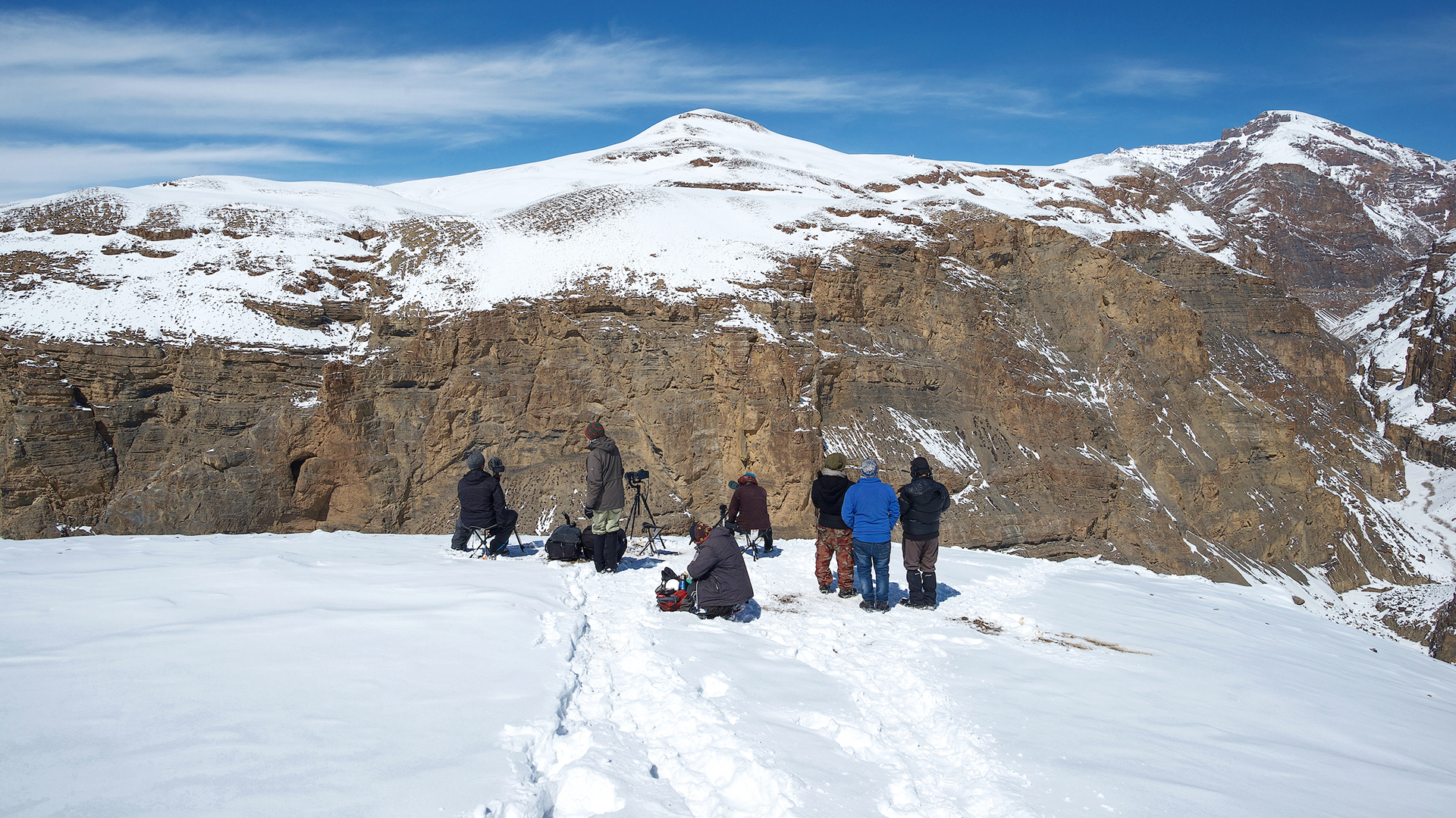 After a two-hour trek up the mountain we stop to set up our gear at the edge of a ravine, with the news that a Snow Leopard has been spotted on the other side.