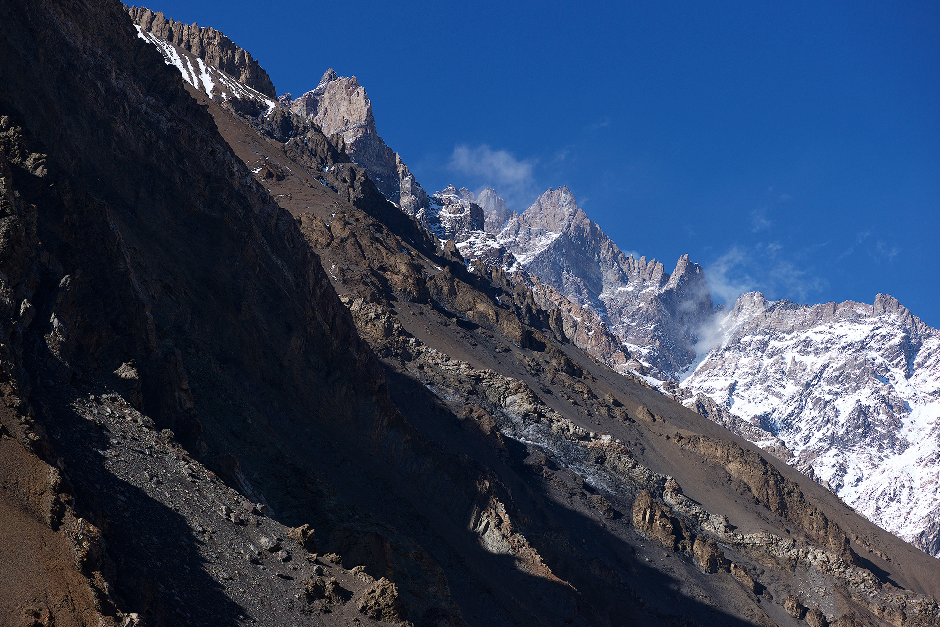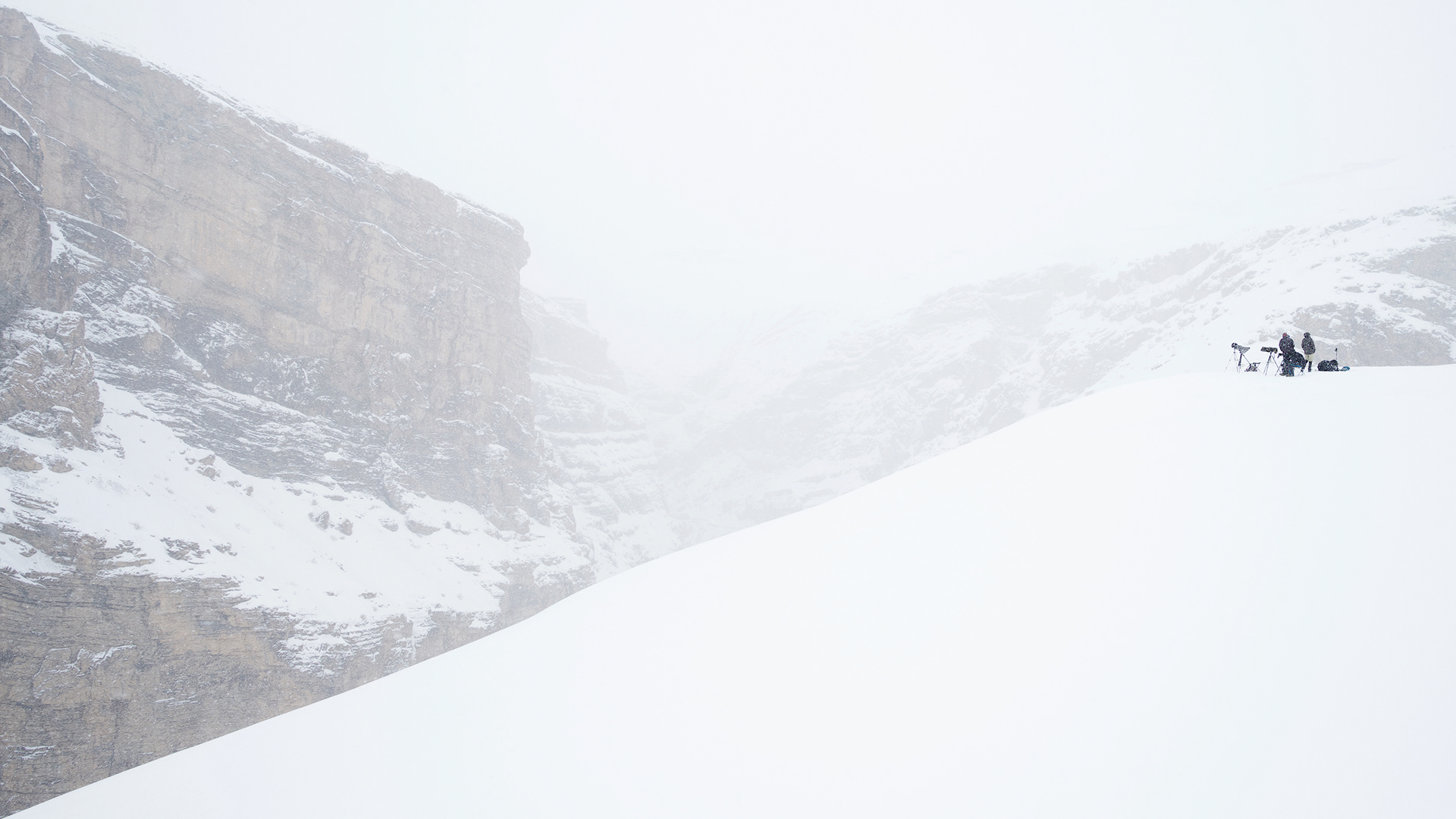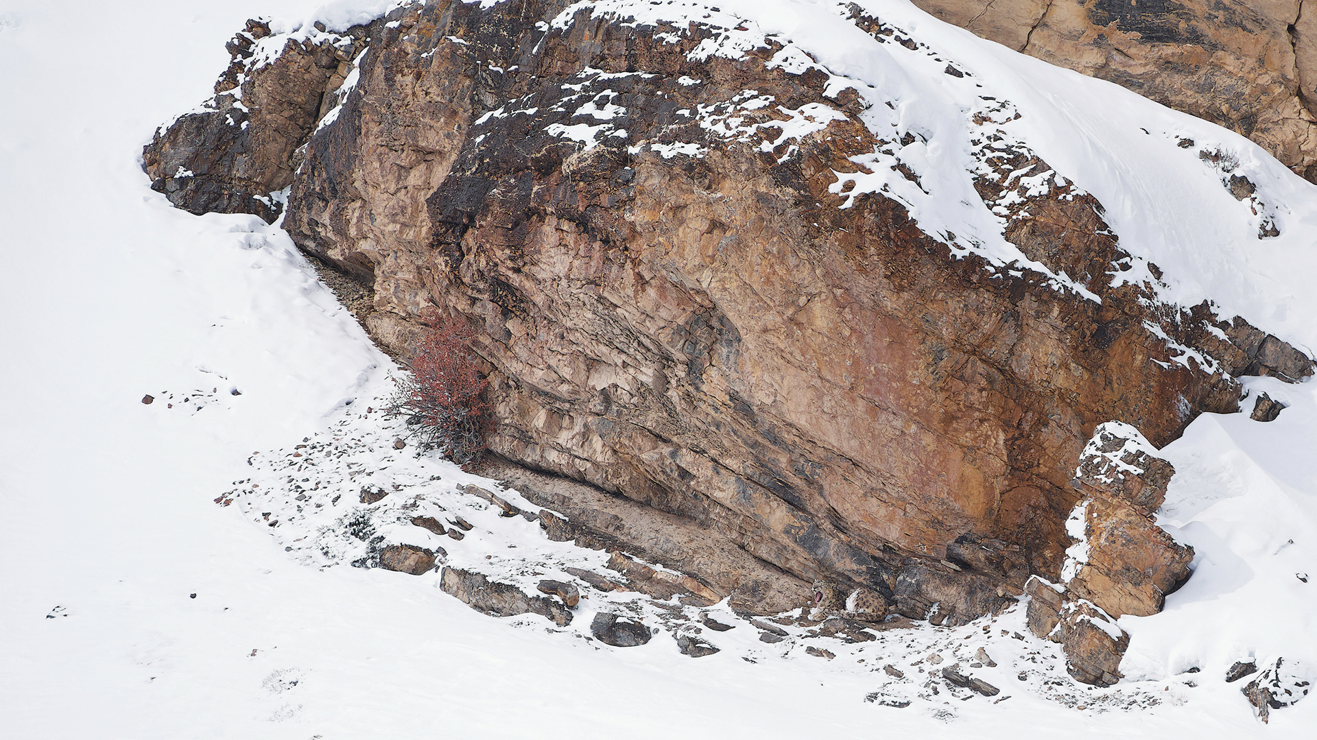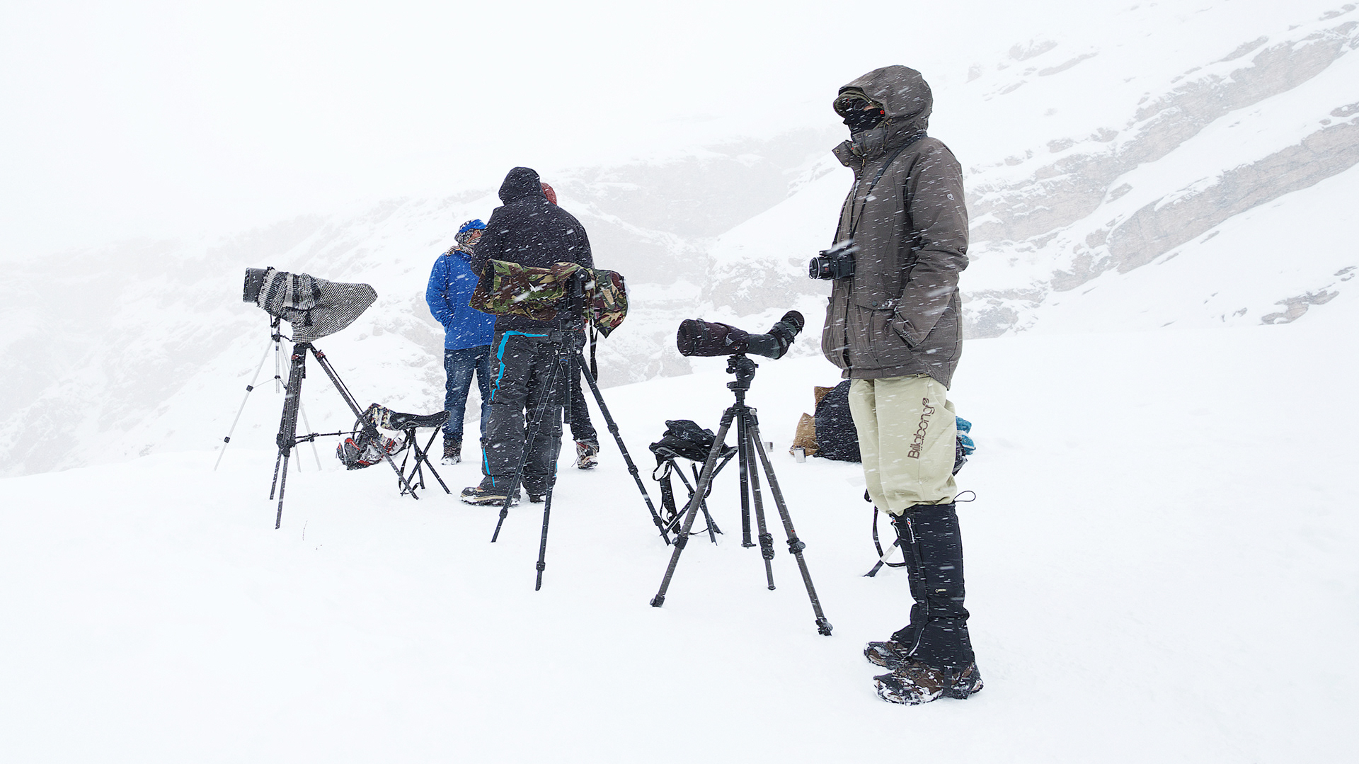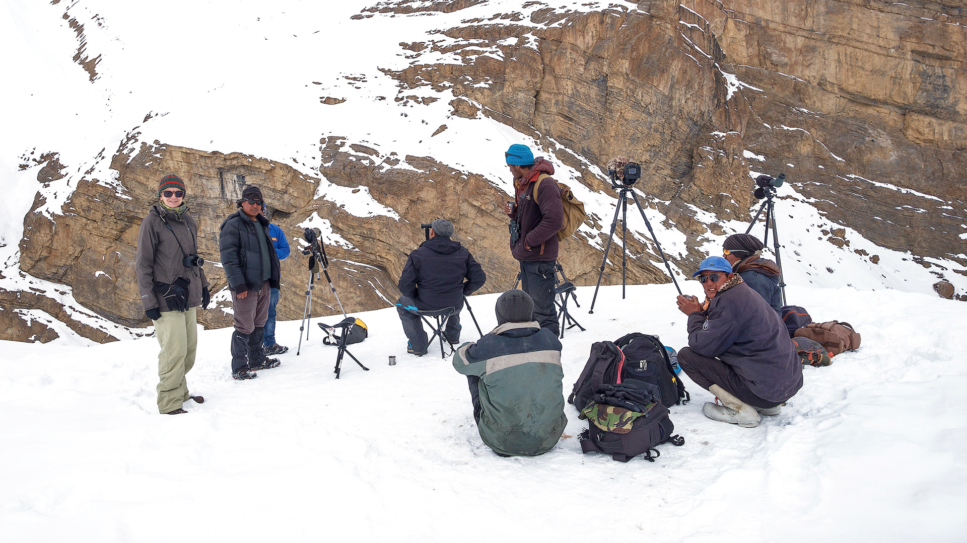 After a two-hour trek up the mountain we stop to set up our gear at the edge of a ravine, with the news that a Snow Leopard has been spotted on the other side.