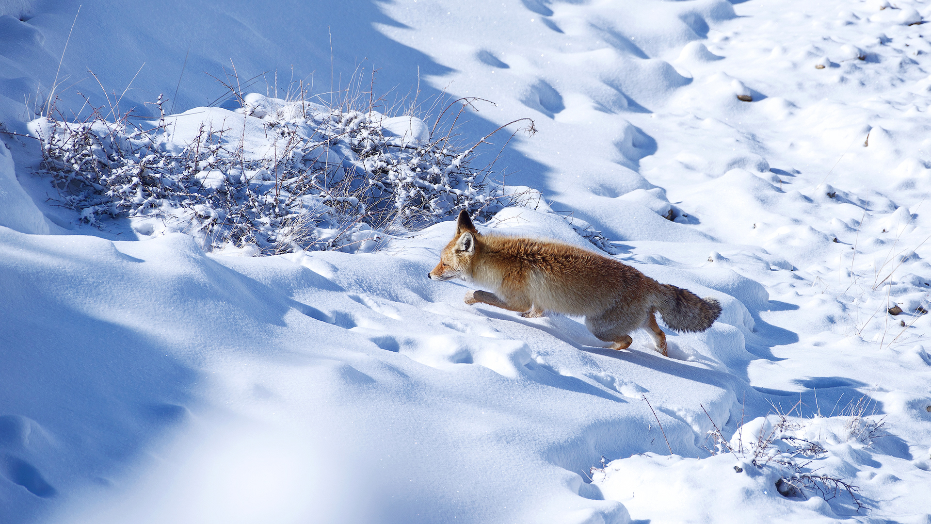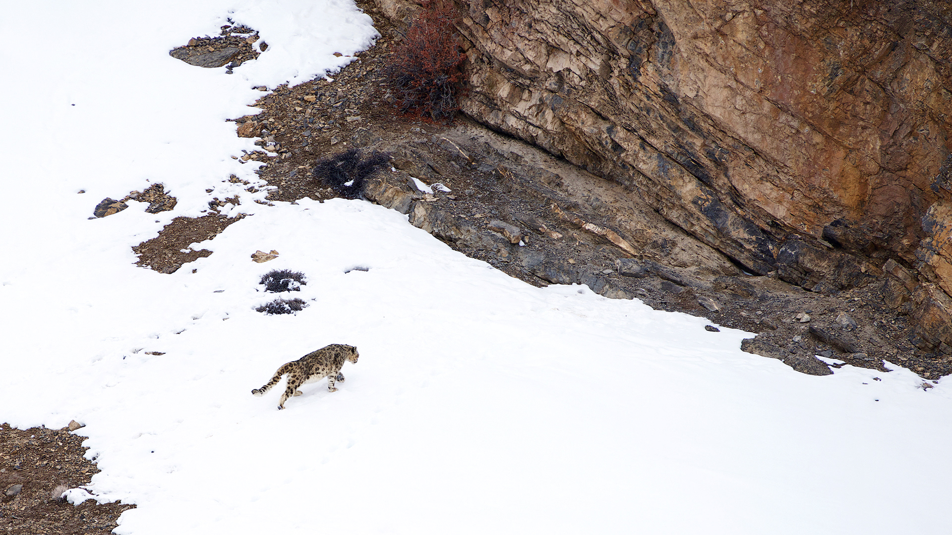 Late afternoon, the sun starts to go down and, after spending most of the day sleeping, the Snow Leopard goes on the move in search of prey.