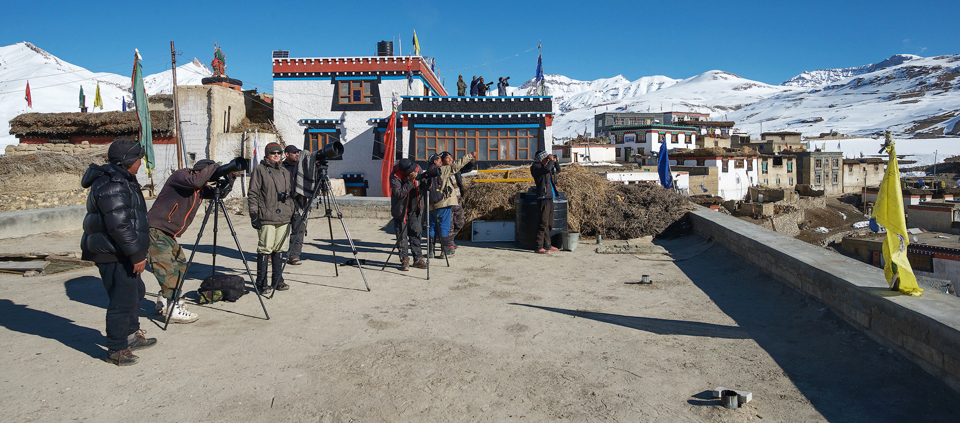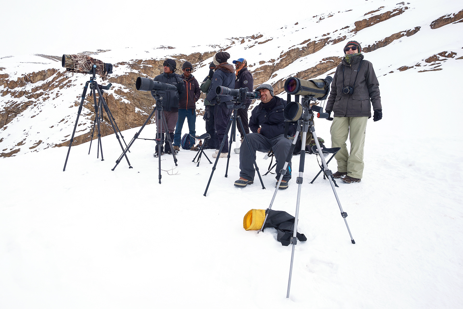 Anne and Nikhil, with the team of guides and trackers from Spiti Valley Tours (Kaza), watching the Snow Leopard in action.