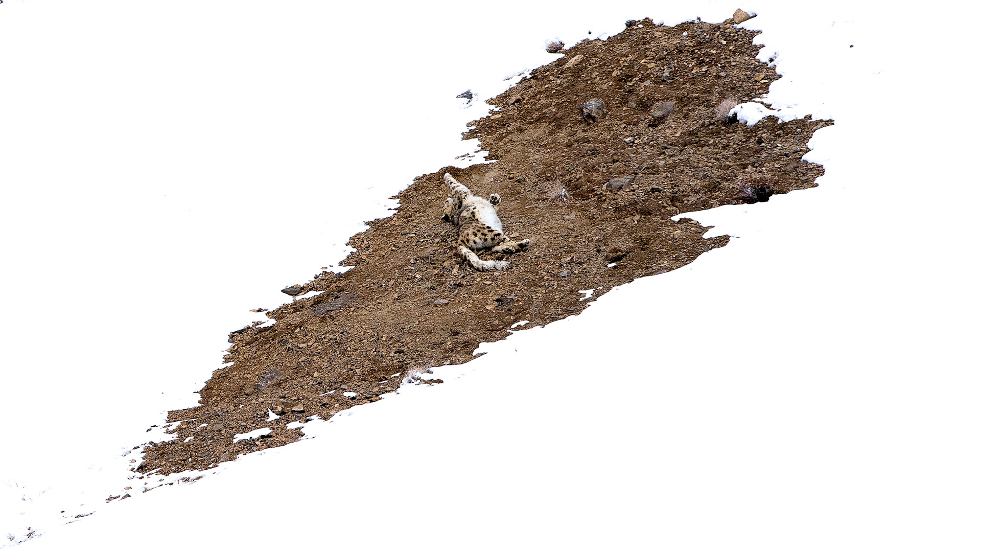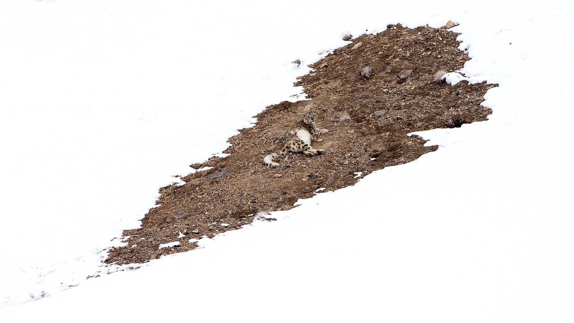 On our arrival we could not believe our good fortune, the Snow Leopard was still there, sleeping on a small, snow-free patch of ground.