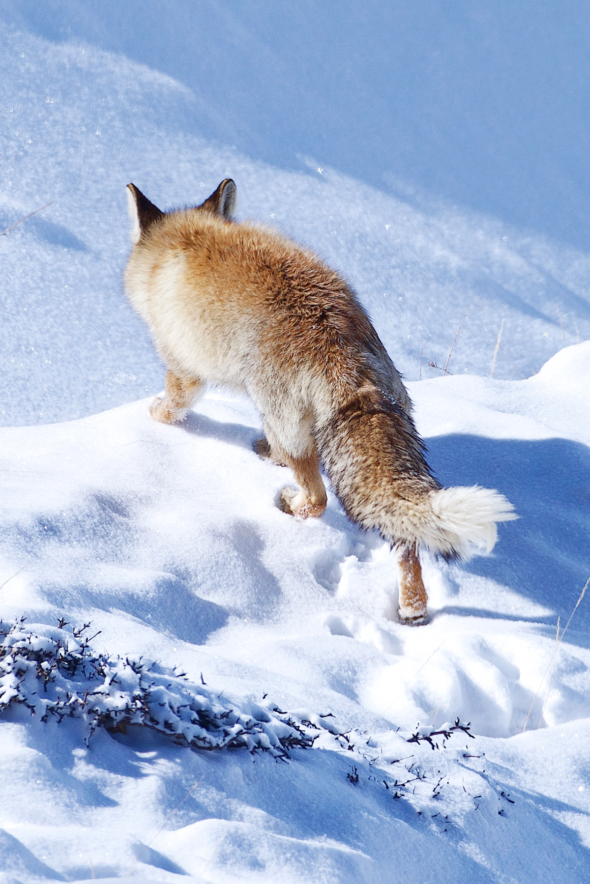He approaches the frozen Ibex carcass which is now almost completely buried in the snow ....