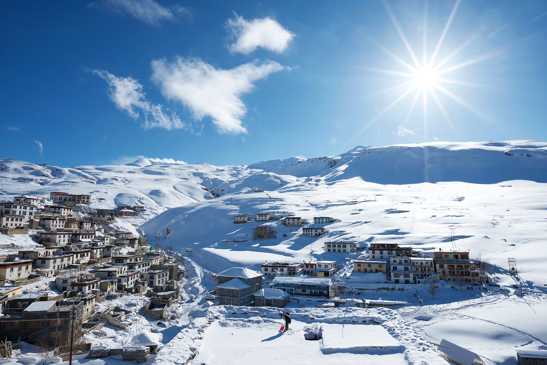 Beautiful morning, the sun rises over the snow-covered village of Kibber.