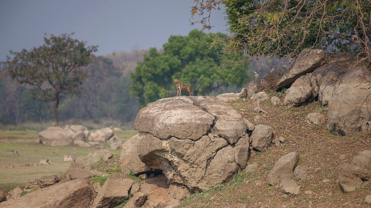 Indian Jackal (Canis aureus indicus) standing high on a rock overlooking the lake.